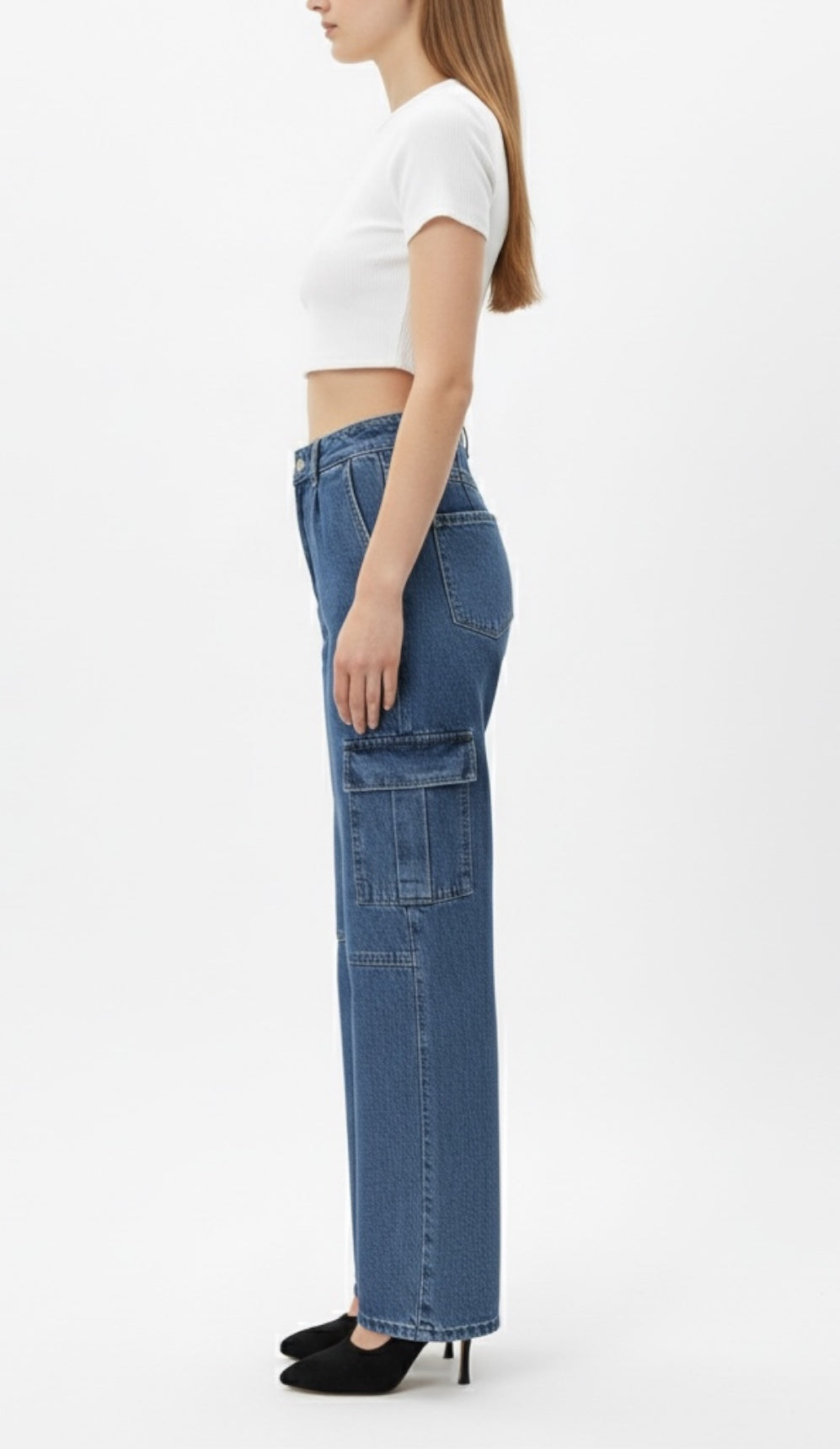 Utility meets everyday style — the Denim Cargo Jeans are designed for structure, comfort, and attitude. Made from 100% cotton denim, this pair features a straight-leg fit with functional side pockets that add a touch of edge while keeping it practical. The rich blue wash and clean stitching give it that timeless cargo look, making it easy to pair with basics, cropped tops, or oversized shirts. A statement piece that’s effortlessly cool and built to last.