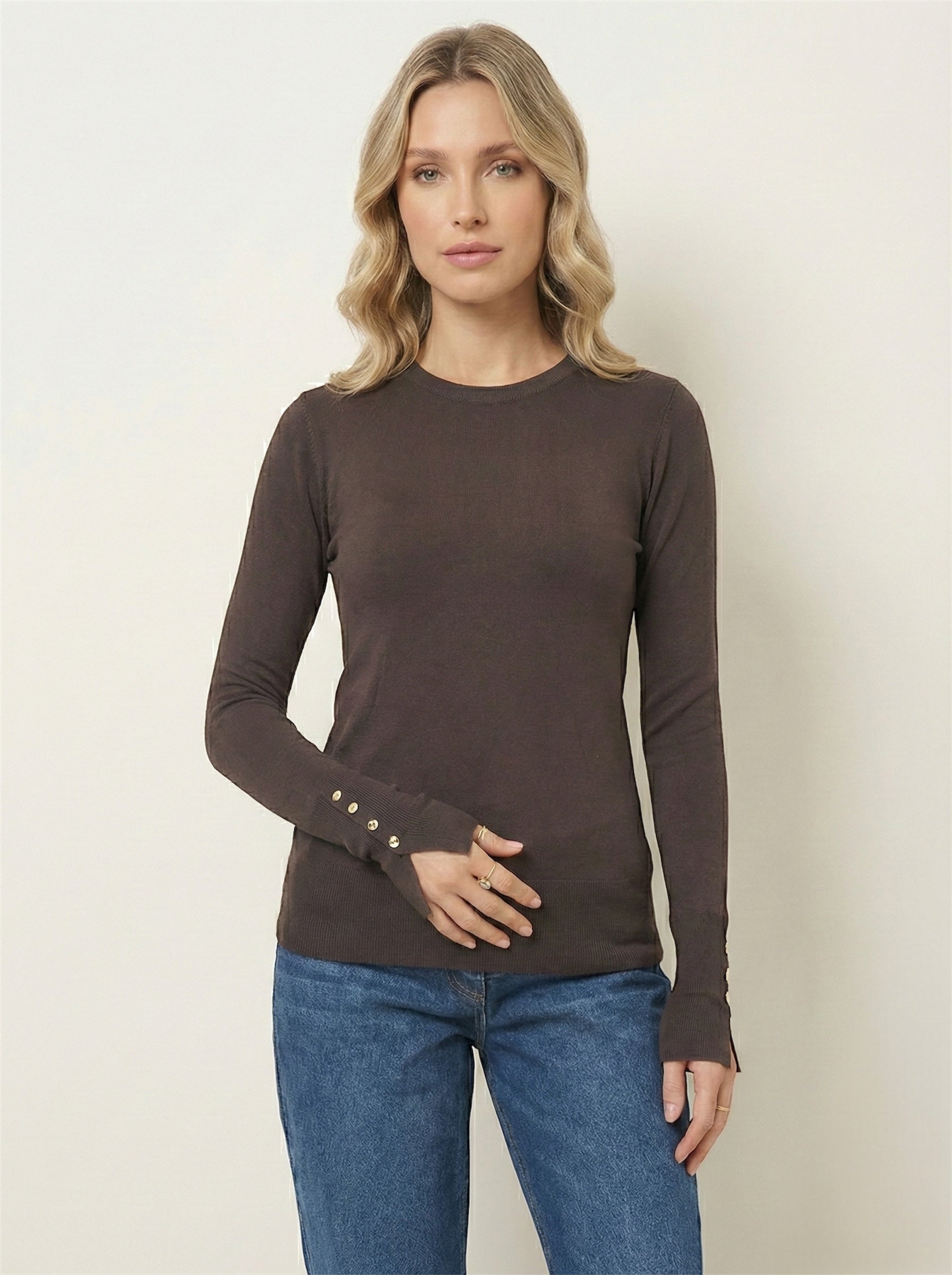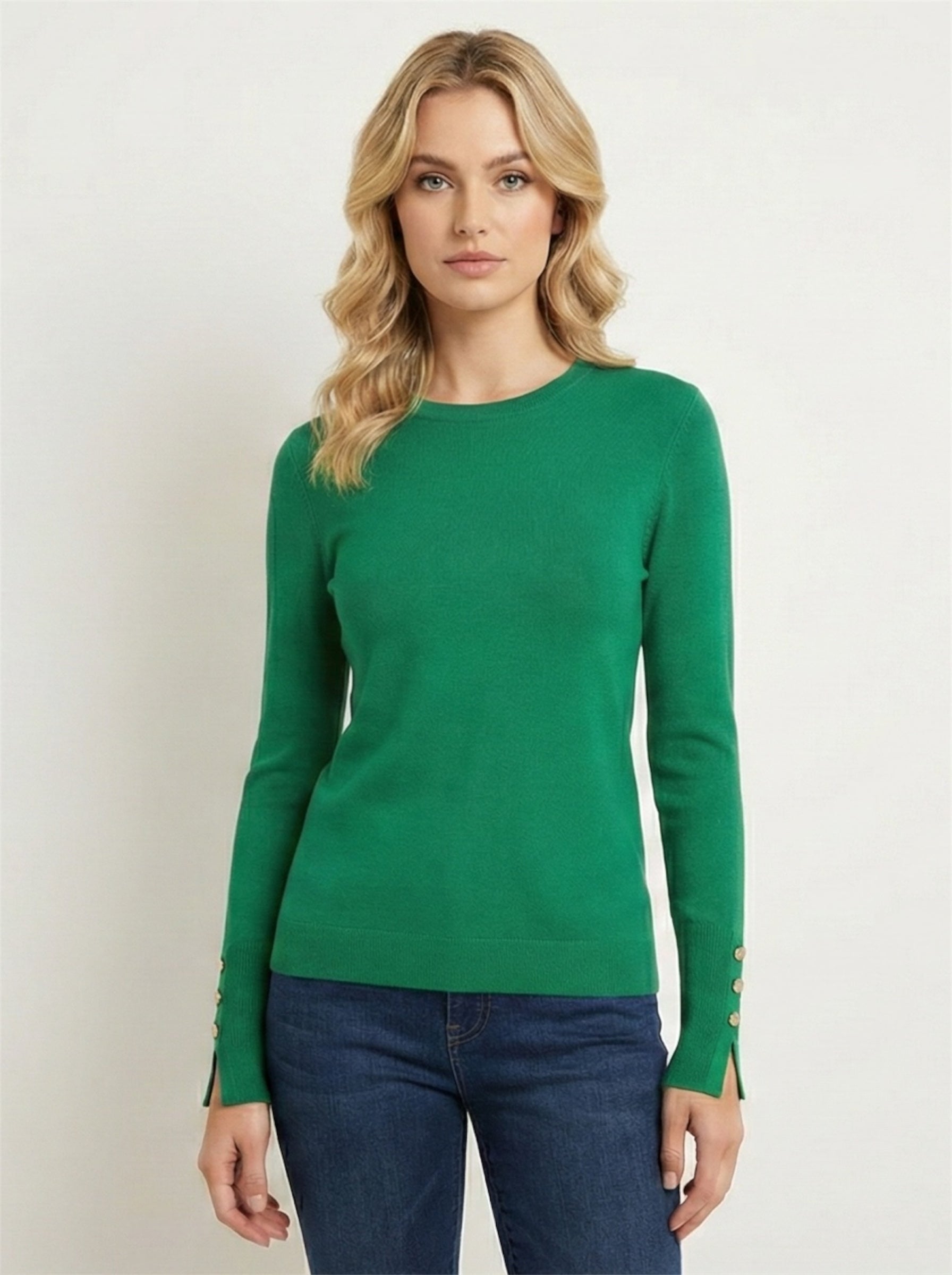 This long-sleeve knit features a sleek, flattering fit with subtle button-cuff detailing that elevates it beyond a basic. Soft, smooth, and lightweight, it’s made to layer effortlessly or stand strong on its own.